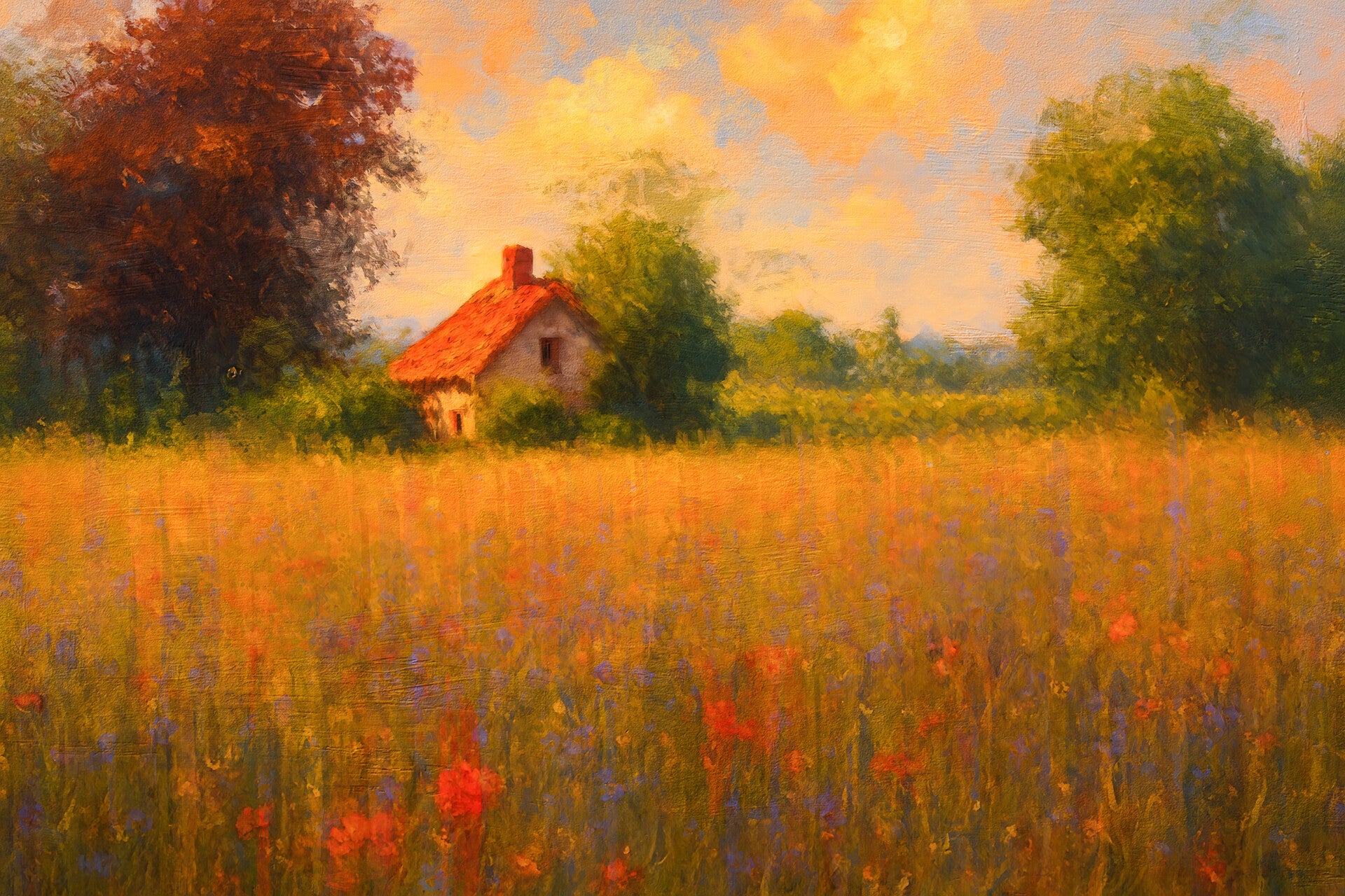 Dit impressionistische olieverfschilderij is door mij gecreëerd op basis van een zelfgemaakte foto die ik nam tijdens een zomerse wandeling door het landelijke landschap. Het oorspronkelijke beeld – een klein, karaktervol huisje met rood dak dat verscholen ligt tussen hoge bomen en omringd wordt door een uitgestrekte bloemenweide – vormde de inspiratie voor dit digitale kunstwerk.